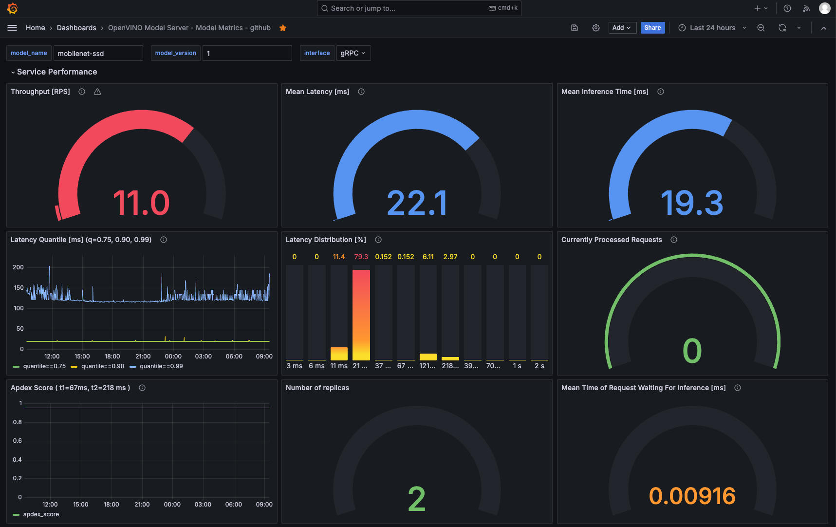 在仓库中,OVMS 暴露的指标(如推理延迟、吞吐量、硬件利用率)可通过 Prometheus 采集。例如,OVMS 提供了 /metrics 端点,支持监控请求处理时间和模型加载状态。用户可以配置 Prometheus 抓取这些指标,并通过 Grafana 创建自定义仪表板,展示 CPU/GPU/NPU 的使用情况、推理性能和系统健康状态。这种集成确保了边缘设备在高负载场景下的稳定性,特别适合工业场景下的持续运行。